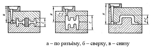 Полость формы заполняют расплавом через каналы 6, называемые литниковой системой. Перед заливкой нижнюю и верхнюю полуформы соединяют стальными цилиндрическими штырями, которые вставляют в отверстия приливов 8 опок. Для предупреждения подъѐма верхней полуформы под действием давления поступающего расплава на собранную форму устанавливают груз 4.