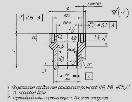 В соответствии с рис. 3.5 определите позиционный допуск размеров отверстий Ø56H9 и Ø51Н10 с учетом диаметра базовой поверхности, класса точности размера и величины допуска размера от базы.