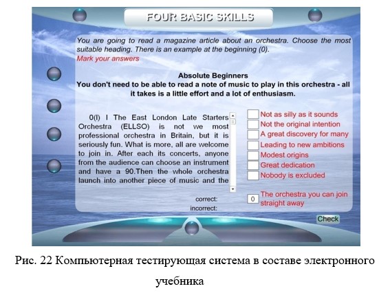 Особенно эффективно использование компьютерных программ в системе текущего и промежуточного контроля. Специально разработанные тестирующие программы, входящие в состав электронного учебника (рисунок 2) содержат тестовые задания, обеспечивают, с одной стороны, возможность самоконтроля для обучающийся, а с другой - принимают на себя рутинную часть текущего или итогового контроля. Компьютерная тестирующая система может представлять собой как отдельную программу, не допускающую модификации, так и универсальную программную оболочку, наполнение которой возлагается на преподавателя.