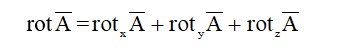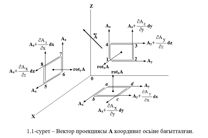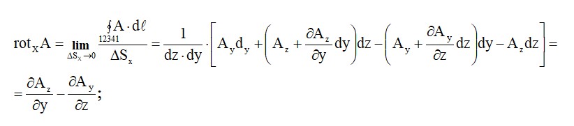 Бұл жерде құраушы проекциялар бар rot A мына ось бойынша x, y, z. rot A бойынша өрнекті анықтаймыз. Ол үшін ауданды анықтау керек ds (тіктөртбұрышты контур) 12341 жазықтыққа параллель жазықтықта YOZ координат жүйесінде XYZ (сурет.1.1)