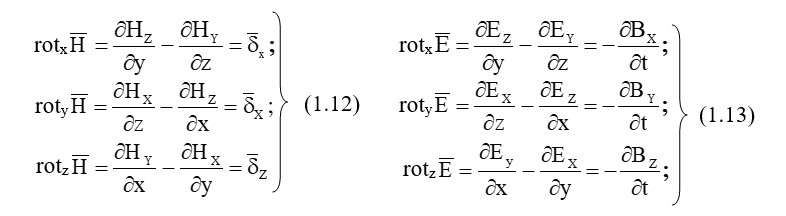 Сәйкесінше (1.11) теңдеуді жазып алып (1.9) және (1.10), Максвеллдің бірінші (1.12) және екінші теңдеуін (1.13) декарттық координатадан алуға болады.
