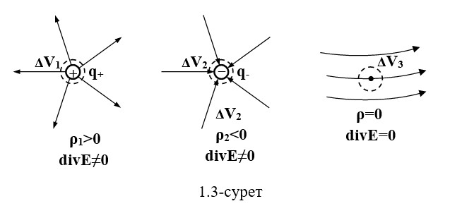 Оң заряд q+ ретінде қарастыруға болады көзі күш сызықтарының электр өрісінің Е, осының жанында сызықтар басталады.Теріс заряд q-ағын ретінде қарастырылады, оның жанында күш сызықтары қарқынмен аяқталады. Сондықтан,кейбір көлемде ΔV электр зарядының көлемдік тығыздығы ρ нөлге тең емес, онда куш сызықтары тұйық бет арқылы ортаға осы вектор арқылы таралады divЕ ≠ 0.