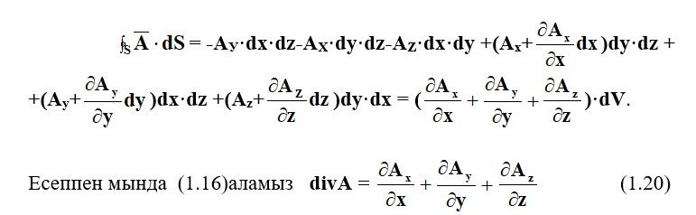 Дивергенция (алшақтық) векторы А–ағынның шегі бар беткі көлем векторы қатынасына ΔV, жабық жердің ішіне S нөлге ұмтылғанда ΔV.