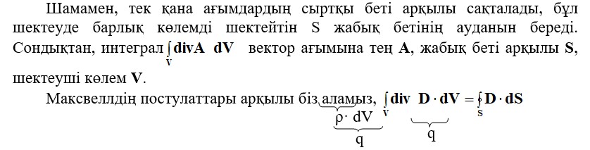 Постулаттың физикалық мағынасы– электр қозғалтқышының вектор ағыны D жабық беті арқылы S кез-келген ортада массаның тығыздығына тең ρ жабық бетімен шектелген көлемде бос электр заряды.