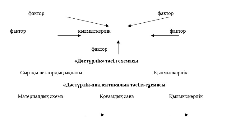 Басқа сөзбен айтқанда, қылмыскерліктің себептілік схемасын осы қаралған үш тәсілдің шеңберінде былайша көрсетуге болады:
