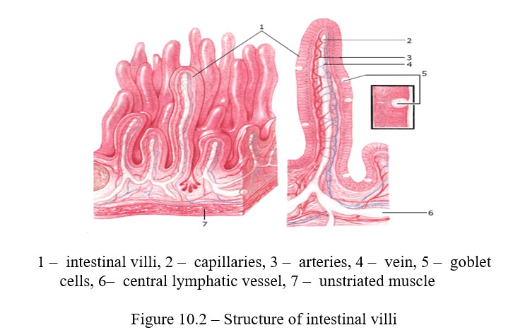 Absorption is the physiological process of the penetration of various substances into the blood or lymph through biological membranes. In the digestive canal, food degradation products in the form of aqueous solutions are absorbed into the blood and lymph through the epithelial cells of the small intestinal mucosa (Figure 10.2).