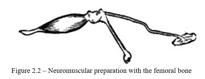 All works on the physiology of excitation are performed on a neuromuscular preparation consisting of the gastrocnemius muscle, femoral bone, sciatic nerve, along with a piece of the spine.