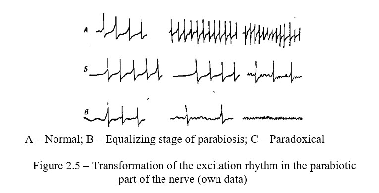 3) The inhibitory phase of parabiosis when the impulses in the altered nerve region cease and the muscle does not respond to stimuli (Figure 2.5, C).