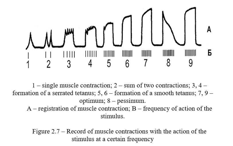 Work progress: A neuromuscular preparation which is fixed in the myograph is used for work. The nerve of the preparation is put on the electrodes from the stimulator. The frequency of stimulation is set at 1 Hz, pulse duration is 1 ms, and the threshold of excitability (smooth rotation of the amplitude handle) on single pulses is found. Make the current strength a little bit more threshold, use the kymograph drum and record single muscle contractions. Then increase the frequency of irritation: switch the "frequency" handle by one division each time when recording. Before increasing the frequency, the stimulant must be switched off every time. Record a serrated and smooth tetanus. Find the optimal frequency of stimulation, to which the muscle responds with a smooth tetanus of maximum height - the optimum (approximately 40-50 Hz). Record the optimum for 4-5 seconds, and then sharply increase the frequency of stimuli to 100 and more Hz and record the frequency pessimum. After 5 seconds, reduce the frequency of stimulation to the optimal level and re-record the tetanus (it should be optimal) (Figure 2.7).