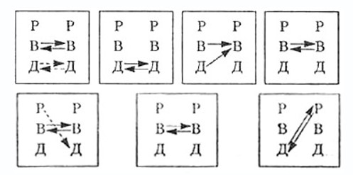 Графически трансактный анализ выглядит так: каждый партнер по общению изображается в виде набора всех трех его позиций: Р, В, Д (сверху вниз), а трансакция изображается стрелкой, идущей от выбранной позиции одного собеседника к предполагаемой позиции другого.