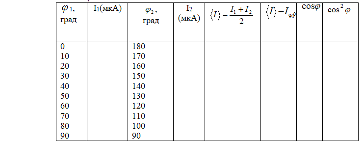 3 Вращая плоскость анализатора от 00 до 900 , через каждые десять градусов замерять фототок и заносить в таблицу;