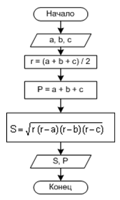 Примечание: В этих блоках знак "=" означает не математическое равенство, а операцию присваивания. Переменной, стоящей слева от оператора, присваивается значение, указанное справа. Причем это значение может быть уже определено или его необходимо вычислить с помощью выражения. Например, операция r = (a + b + c) / 2 - имеет смысл (переменной r присвоить значение r = (a + b + c) / 2), а выражение (a + b + c) / 2= r - бессмыслица.
