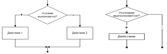 На практике часто встречаются задачи, в которых в зависимости от первоначальных условий или промежуточных результатов необходимо выполнить вычисления по одним или другим формулам. В таких алгоритмах выбор направления продолжения вычисления осуществляется по итогам проверки заданного условия. Ветвящиеся процессы описываются оператором IF (условие ЕСЛИ). В блок-схемах разветвленные алгоритмы изображаются так, как показано на (рисунок 6.2).