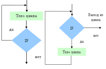 Особенностью второй схемы является то, что цикл выполняется хоты бы один раз, так как первая проверка условия выхода из цикла осуществляется после того, как тело цикла выполнено.