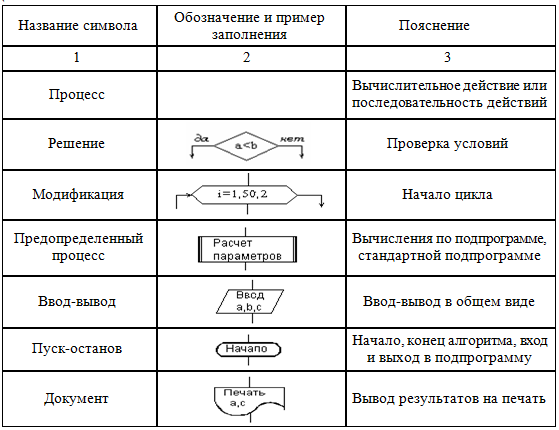 В схеме алгоритма каждому типу действий (вводу исходных данных, вычислению значений выражений, проверке условий, управлению повторением действий, окончанию обработки и т.п.) соответствует геометрическая фигура, представленная в виде блочного символа (блока), называемая символом действия. Символы действия соединяются линиями переходов, определяющими очередность выполнения действий (таблица 4.1).