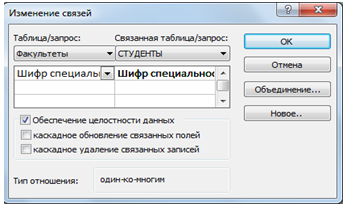При создании межтабличной связи очень важно, из какой таблицы в какую перетаскивается поле. Поля надо перетаскивать из таблицы со стороны «один» в таблицу со стороны «многие». При этом в окне Изменение связей (рисунок 3.3) главная таблица (со стороны «один») окажется слева под заголовком Таблица/запрос, а таблица со стороны «многие» - справа под заголовком Связанная таблица/запрос. При попытке сделать наоборот мы получим сообщение об ошибке.