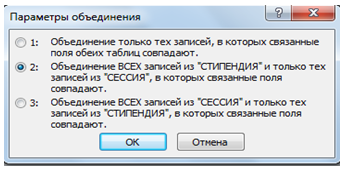В окне Изменение связей щелкнуть на кнопке Объединение. Появится окно Параметры объединения (рисунок 3.4). Если необходимо, например, чтобы в дальнейшем при объединении данных таблиц отображались все записи таблицы «СТИПЕНДИЯ», независимо от того, имеется ли соответствующая запись в таблице «СЕССИЯ», надо выбрать 2-й тип объединения.