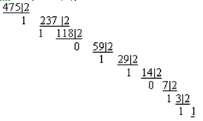 Например. Перевести данное число из десятичной системы счисления в двоич¬ную 475,1875(10);