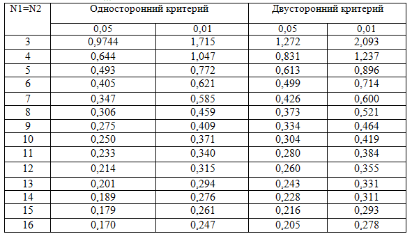 Таблица 4 – Критерий для сравнения при малых выборках и равном объеме (n1 = n2) ( по lord)