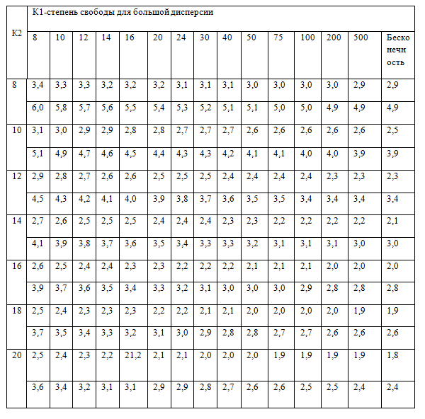 Таблица А. 5 – Критические значения критерия F-Фишера в зависимости от степеней свободы (К) и уровней значимости Р = 0,05 (верхняя строка) и Р = 0,01 (нижняя строка) (по Н. В. Смирнову и И. В. Дунину-Барковскому)