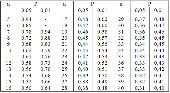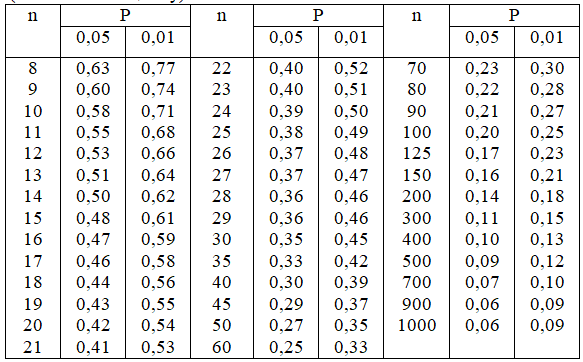 Таблица А. 6 – Значения коэффициента корреляции при различных уровнях значимости (Р) и числах степеней свободы (k = n – 2)