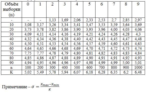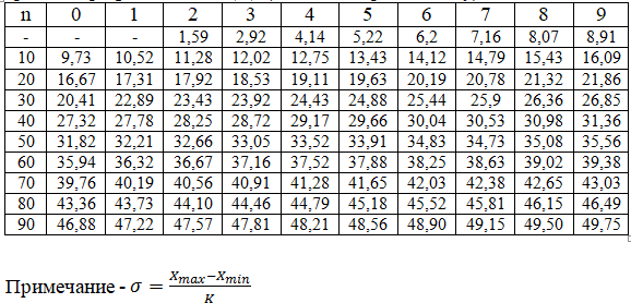 Талица А. 1 – Коэффициент (К) для ускоренного расчёта стандартного отклонения (σ) (по Р. Н. Бирюковой)