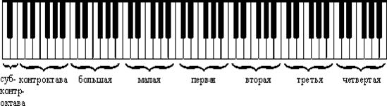 Ниже приводится схема звукоряда музыкальной системы, изображенного в виде клавиатуры с делением на октавы: