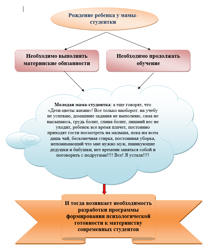 Преодоление всех этих проблем зависит от уровня психологической готовности самой мамочки. Чем выше ее уровень, тем проще и безболезненней будет их решение. А мы как раз таки и наблюдаем, что все трудности, с которыми сталкивается почти каждая мама, для многих просто непреодолимы. В Германии зафиксировано много случаев непреднамеренной смерти младенцев, вследствие неготовности женщин к материнству. А что интересное: сами мамочки могут занимать высокие должности, пользоваться большим уважением окружающих, но быть неприспособленным к вопросам бытовой жизни. В нашей же стране мамами становятся довольно-таки рано, в том числе и девушки, обучающиеся в колледже или университете. А что же делать в сложившейся ситуации нашим молодым мамам? И что происходит, если современные студентки стали мамами без психологической подготовки (рисунок 2)?