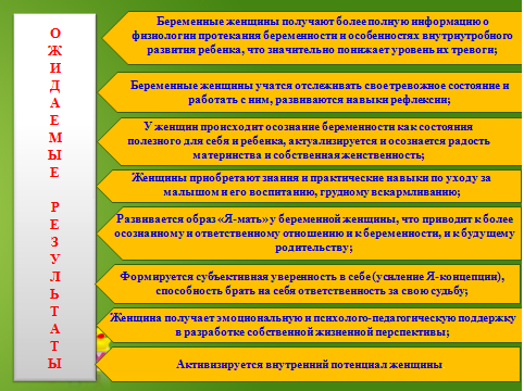 Данная программа способ-ствует формированию нравст-венно-ценностной ориентации личности и психологической готовности к материнству уже ставших мамами современных студентов, овладению культурой самообразования, самовоспита-ния, самоконтроля и творческого саморазвития.