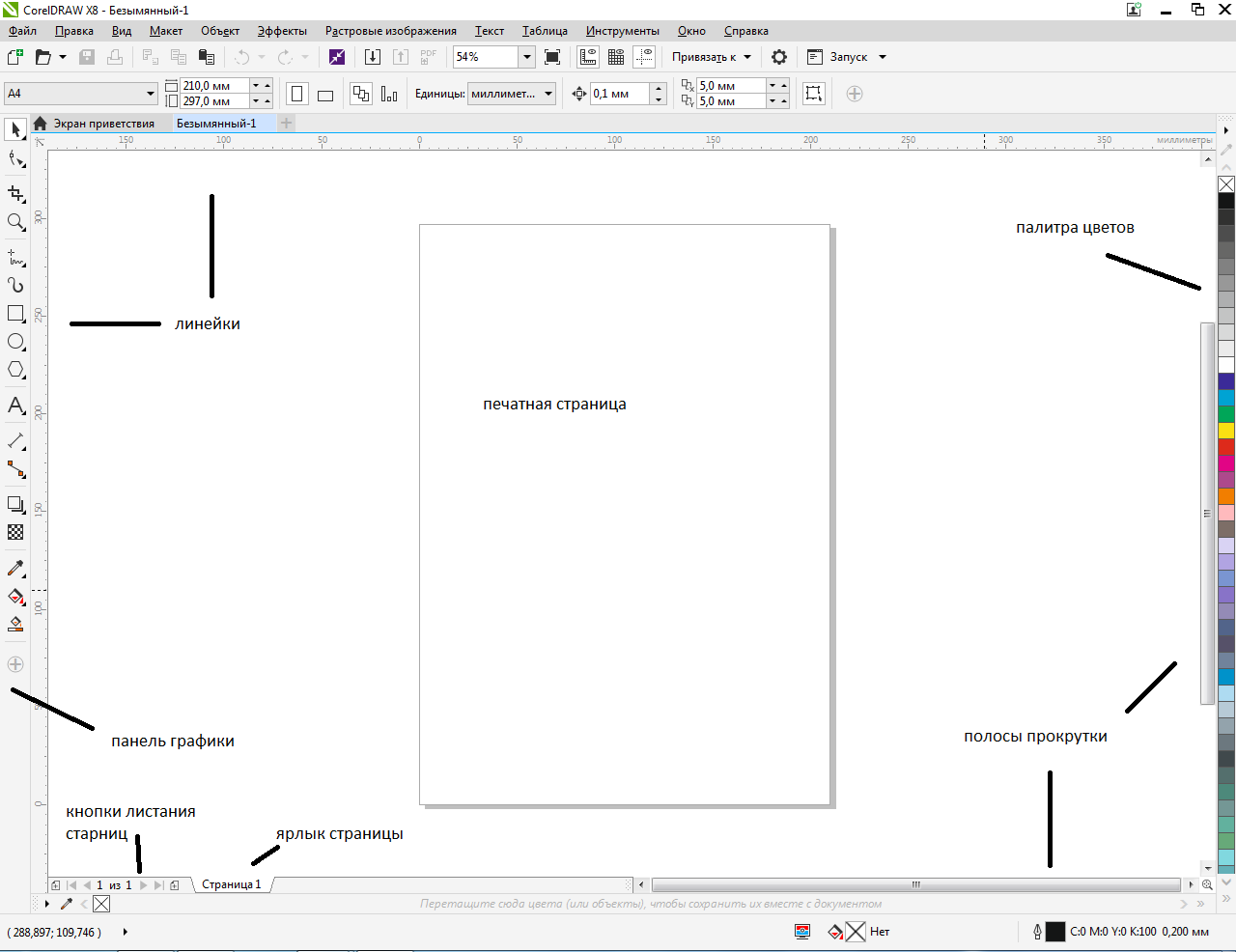 | Печатная страница | представляет собой прямоугольник в окне документа, в пределах которого строится изображение. Размеры печатной страницы, параметры макета, фон, направляющие и др. можно задать с помощью диалогового окна |