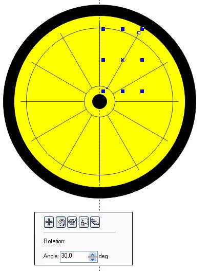 | 6) Переносим центр вращения этой линии в центр (простите за повторение) самой маленькой окружности (5ой) и с помощью вращения (Rotate) дублируем эту линию под углом 30 градусов, как показано на рисунке ниже: | ![]() |