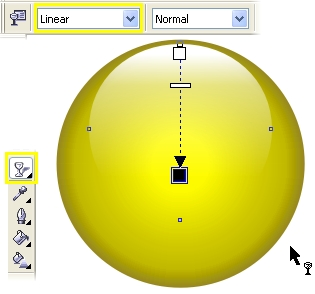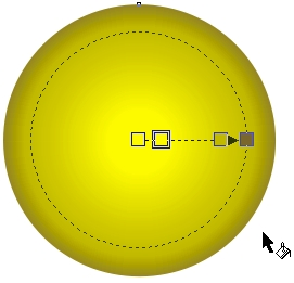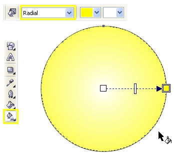 | 2 Для заливки используйте палитру CMYK, заданную по умолчанию. Палитра вызывается через верхнее меню последовательным выбором Window > Color Palettes > Default CMYK palette. Не снимая выделения с окружности, выберите желтый цвет (Yellow; C0, M0, Y100, K0) для заливки. Возьмите инструмент Interactive Fill (G на клавиатуре) и в верхнем меню установите радиальный тип градиентной заливки (Fill Type - Radial), как показано на рисунке. | ![]() |