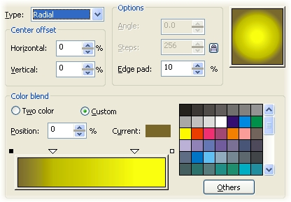 | 3 Для точной настройки цветов и их положения в радиальном градиенте рекомендуется использовать окно Fountain Fill (на клавиатуре F11). Чтобы задать параметры градиента нажмите кнопку Custom в этом окне. Выделите крайний левый цветовой маркер (положение 0%) и нажмите Others, чтобы появилось больше настроек цвета. Установите значения CMYK так: C40, M50, Y100, K20. Установите значения крайнего правого маркера следующим образом: C0, M0, Y100, K0. Двойным щелчком над полосой градиента добавьте еще два цветных маркера в позиции 25 и 80% со значениями цвета C0, M5, Y100, K20 и C0, M0, Y100, K0 соответственно. | ![]() |