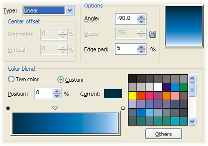 | 3 Вы берите инструмент Interactive Fill и протащите направляющую сверху вниз, чтобы применить градиентную заливку с параметрами по умолчанию. Чтобы добавить цвета в нужных точках, откройте диалоговое окно Fountain Fill (F11) и в нем выберите Custom. В примере использовалась синяя цветовая схема. Для маркера 0% использован цвет C100, M20, Y0, K80, для маркера 100% - C10, M0, Y0, K0. Добавьте третий маркер в позиции 40% и установите ему цвет C100, M20, Y0, K20. Напоследок установите значение Edge Pad 5% и удалите видимую обводку. | ![]() |