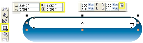 | 6 Выделите прозрачный прямоугольник и сделайте его копию, нажав + на цифровой клавиатуре. Растяните копию так, чтобы ее нижний край почти доходил до нижней границы кнопки. Залейте ее цветом 100% Cyan, нажав на соответствующий цветной квадратик в палитре. | |
