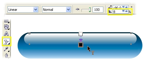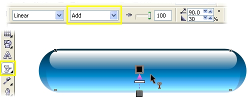 | 7 Возьмите инструмент Interactive Transparency и протяните направляющую как показано на рисунке. Чтобы слегка смягчить эффект прозрачности, протащите квадратик 60% Black из палитры на место белого маркера инструмента Transparency. В верхнем меню среди параметров прозрачности выберите Add. Выделите все объекты в составе кнопки и сгруппируйте их (Ctrl+G). Ваша кнопка практически готова. | ![]() |