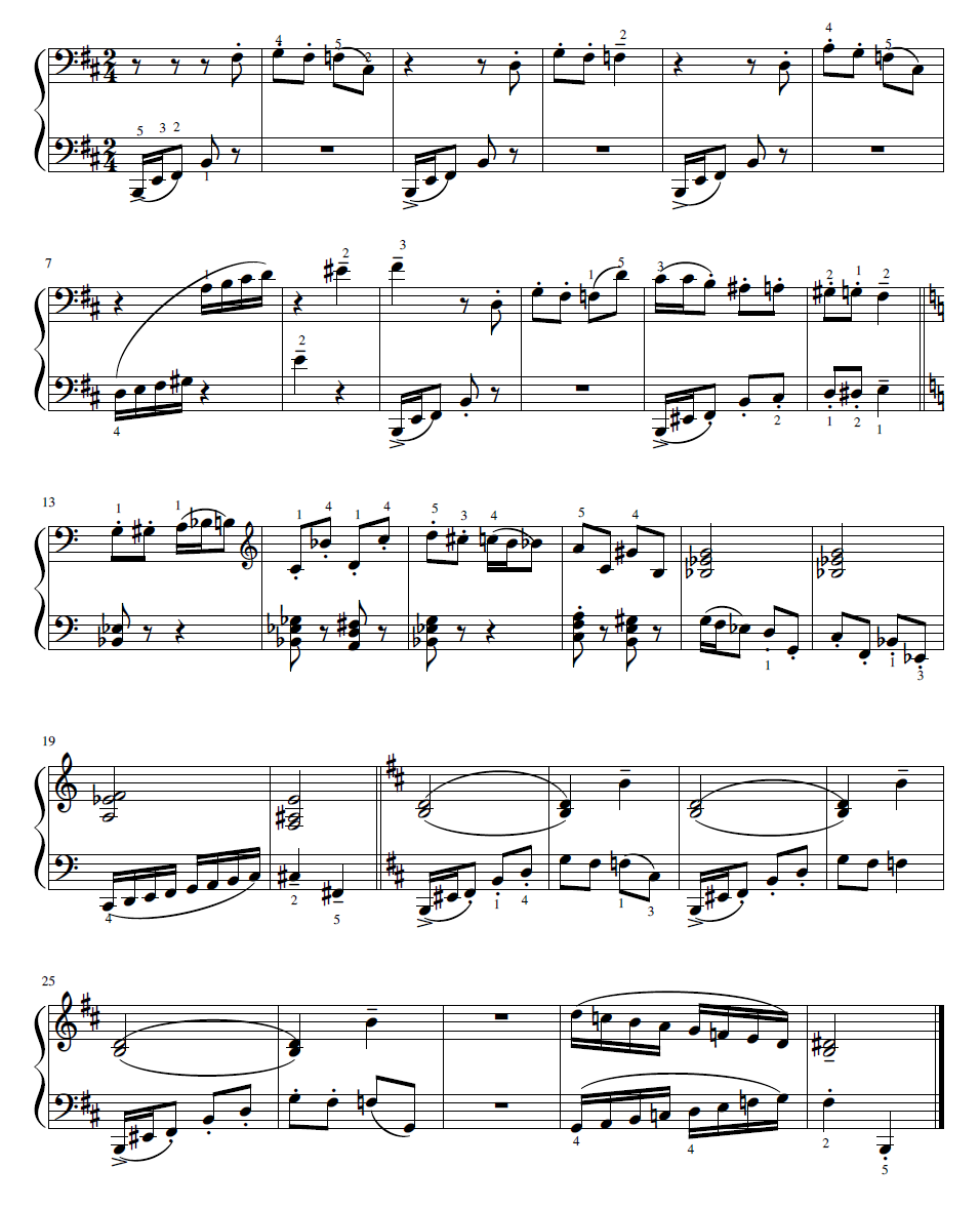 Пьеса штрихтардың алуын түрлігіне және олардың үйлесуіне бай, үйрену кезінде әр әуен мен фразаны кезек-кезек игеру керек.