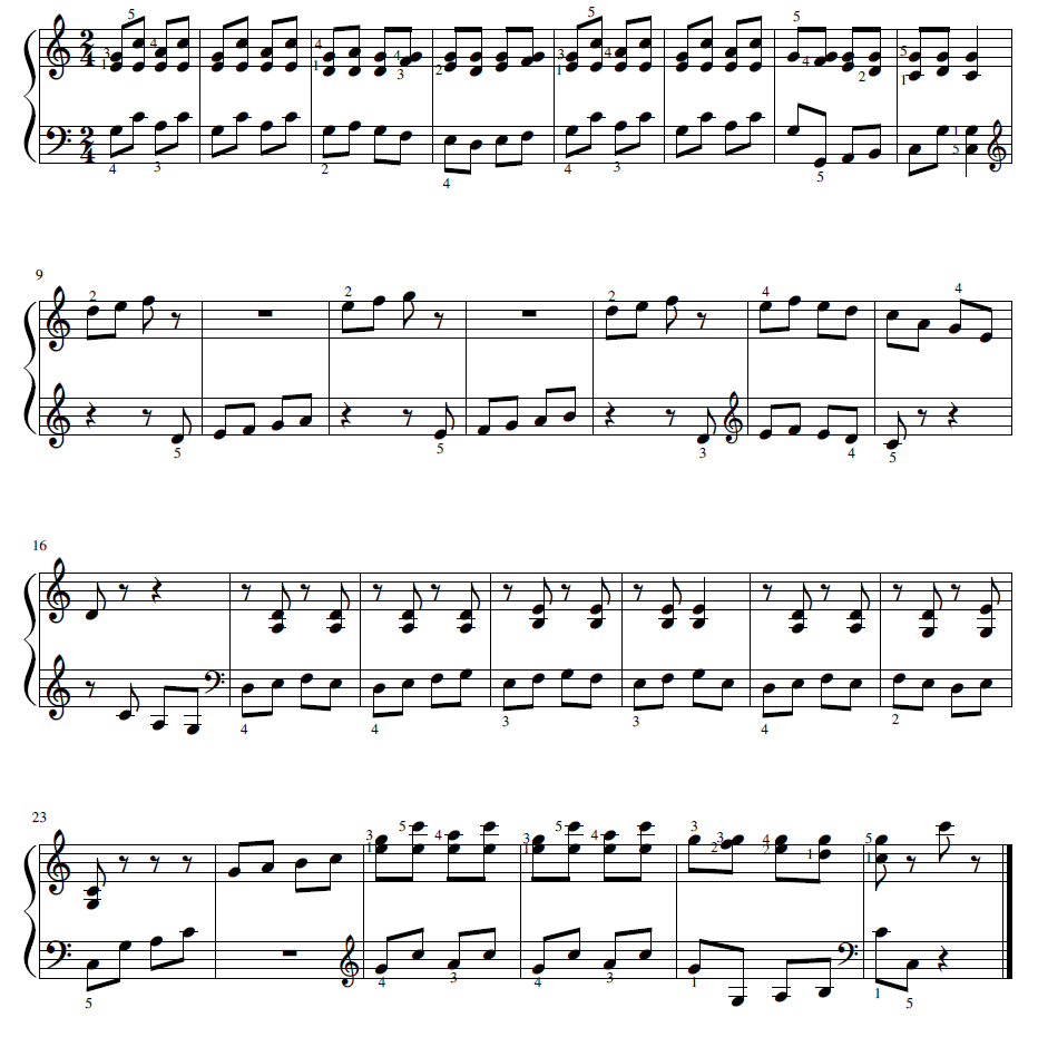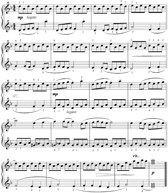 Бұл пьесада қолдың айқастырылуы оң қол партиясын бұзбай, сол қолымен дәл басуды талап етеді. Әуенді қозғалмалы сүйемелдеумен біріктіре жүргізу жақсы үйлестіруді қажет етеді. Әуен мен сүйемелдеу партияларын кезек-кезек әрі бірге үйрену қажет.