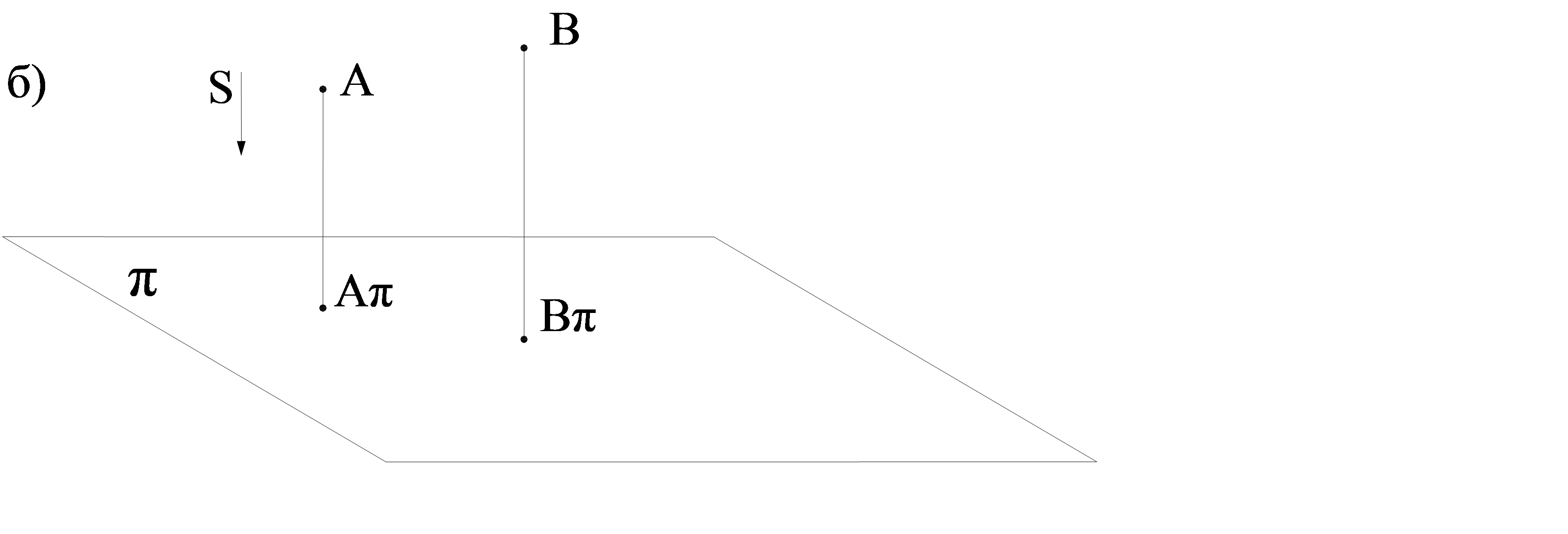 π - проекция жазықтығы; А, В - проекцияланатын нүктелер; S - проекция бағыты; Аπ , Вπ - А, В нүктелерінің π жазықтығындағы перпендикуляр проекциялары