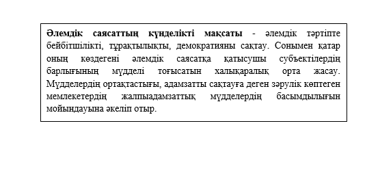 - Халықаралық саясат – мемлекеттердің халықаралық аренада бірлескен қызметі болып табылады. Саясаттың бұл саласы мемлекеттерді оларға ортақ мәселелерді бірлесіп, келісімдер арқылы шешу жолдарын көрсетеді. Халықаралық саясаттың елдер мен халықтар арсындағы өзара тәуелділіктің, шешімін табу үшін халықаралық әріптестікті талап ететін мәселелердің көбеюіне байланысты маңызды арта түседі.