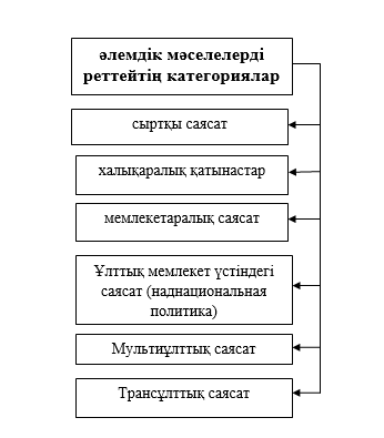 Ұлттық мемлекеттер шеңберінен тысқары жүргізілетін, әлемдік мәселелерді реттеуге, немесе оларға ықпал етуді мақсат тұтатын саясат келесідей категориялардан тұрады.