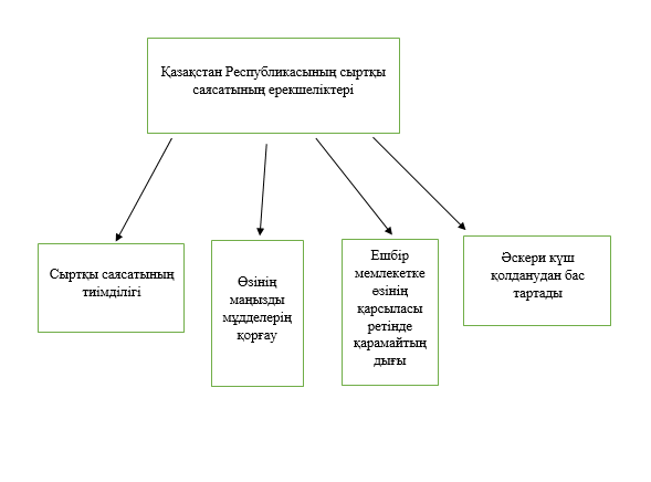 Қазақстан Республикасының сыртқы саясаты белсенділігімен, тепе-теңдік сақтауға ұмтылысымен, прагматизмдігімен, сындарлы сұхбат жүргізуге талпынысымен және көпжақты ынтымақтастыққа бағытталғандығымен ерекшеленеді. Халықаралық аренада мемлекетіміз өзінің тарихи, геосаясаттық және экономикалық факторларына байланысты көп ғасырлар бойы сыртқы саясатын халықаралық ынтымақтастық, көршілес мемлекеттермен татуластық және олардың аймақтық біртұтастығын құрметтеу принципіне негіздеп жүргізіп келеді. Қазақстанның өзге мемлекеттермен тең құқылы және екі жаққа да тиімді қарым-қатынас құруға дайындығы оның бүгінгі күні дипломатиялық байланыс орнатқан шет мемлекеттердің санының көптігімен дәлелденіп отыр. 1991 жылы тәуелсіздік алған сәттен бастап, біздің республика әлемнің 130 мемлекетімен дипломатиялық қарым-қатынас орнатты.