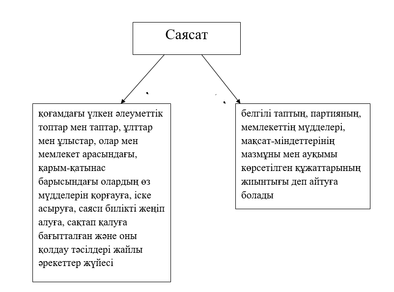 Саясат ұғымына тоқталатын болсақ, «саясат» дегеніміз – қоғамдағы үлкен әлеуметтік топтар мен таптар, ұлттар мен ұлыстар, олар мен мемлекет арасындағы, қарым-қатынас барысындағы олардың өз мүдделерін қорғауға, іске асыруға, саяси билікті жеңіп алуға, сақтап қалуға бағытталған және оны қолдау тәсілдері жайлы әрекеттер жүйесі. Басқа сөзбен айтқанда, саясат ұғымы қоғамның саяси саласындағы барлық құбылыстар мен үрдістерді, тенденцияларды бейнелейді. Осы тұрғыдан алғанда саясатты белгілі таптың, партияның, мемлекеттің мүдделері, мақсат-міндеттерінің мазмұны мен ауқымы көрсетілген құжаттарының жиынтығы деп айтуға болады.