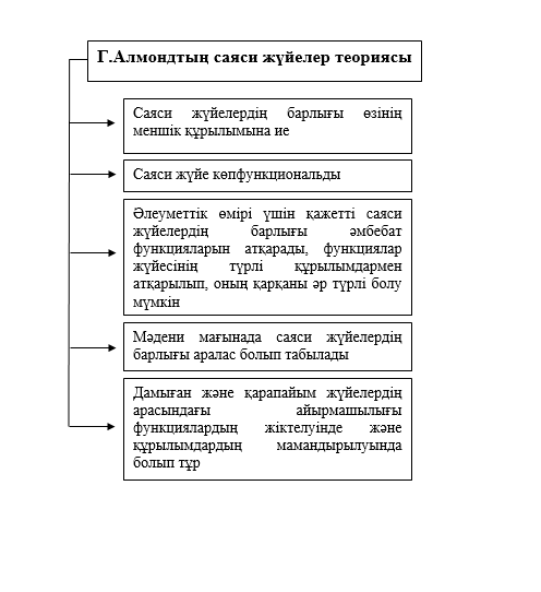Г.Алмонд саяси мәдениет деңгейі мен құндылықтар жүйесінің негізінде саяси жүйені: ағылшын-американдық, құрылықтық-еуропалық, жарым-жартылай индустрияланған, тоталитарлық деп жіктейді. Саяси жүйенің ағылшын-американдық түрі ондағы саяси мәдениеттің бірыңғайлылығымен, біртектілігімен сипатталады. Құрлықтық-еуропалық саяси жүйенің саяси мәдениеті, ұстанатын құндылықтары әр түрлі келеді. Жарым-жартылай индустрияланған саяси жүйеге аралас мәдениет тән. Тоталитарлық саяси жүйеде саяси мәдениеттің таптық сипаты бар.