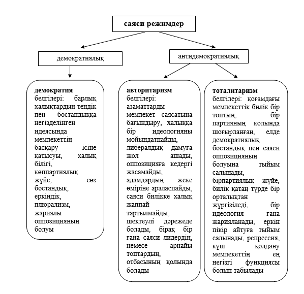 Саяси режим - саяси билік арқылы орталықтан басқарылатын қоғамның тыныс-тіршілігін қамтамасыз ететін, біртұтас организм ретіндегі күрделі құрылым. Отандық және шетелдік құқықтық және саяси әдебиетерде саяси режим түсінігіне байланысты әр түрлі көзқарастар айтылып жүр. Олардың қатарына саяси режимді Қазақстанда зерттеген заңгерлер С.Н. Сәбікенов, С.Зиманов, Сапарғалиев, А.С. Ибраева, С. Табанов, Г.Сапаргалиев, Баймаханов М.Т., Д.А.Булгакова. Ал шет елдік ғалым заңгерлер А.В.Малько, М.Н.Марченко, Б.А. Страшун, С.С.Алексеев, В.Н.Хропанюк және саясаткерлер американдық ғалым Д.Истонды, американдық саясаттанушы Г.Алмондты, Т.Парсонстың теориясын, К.Доичтың теориясын (кибернетикалық теория), Ресейлік саясатанушылар М.Г.Анохинның, Ф.М.Бурлацкийдің, Р.А.Матреевтың және басқалардың теорияларын жатқызуға болады.