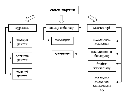 4) қауымдастық партия. Ол адамдарды белгілі бір саяси жолды ұстанғандығына қарай емес, ортақ көзқарас, ұқсас мүдделеріне орай, маңызды мәселелерді ортақ талқылау үшін біріктіреді.