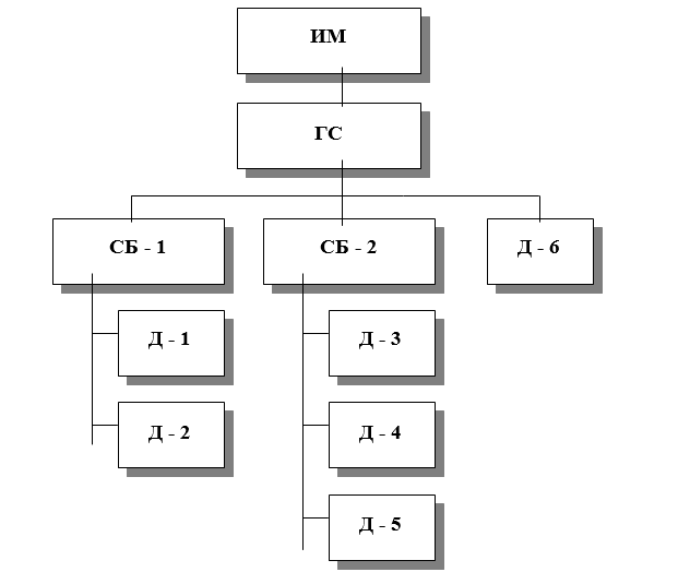 Определить длительность цикла сложного процесса изготовления механизма, построить цикловой график, учитывая, что детали пролеживают на комплектовочном складе 2n часов (n – номер варианта студента). Длительность циклов простых процессов приведена в таблице 1.2, схема сборки механизмов – на рисунке 1.4