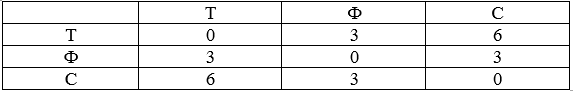 Для начала принимаем любой случайный вариант планировки. Например: токарный – T (1), фрезерный – Ф (2), сверлильный – С(3). Номера в скобках обозначают последовательность расположения станков на участке.