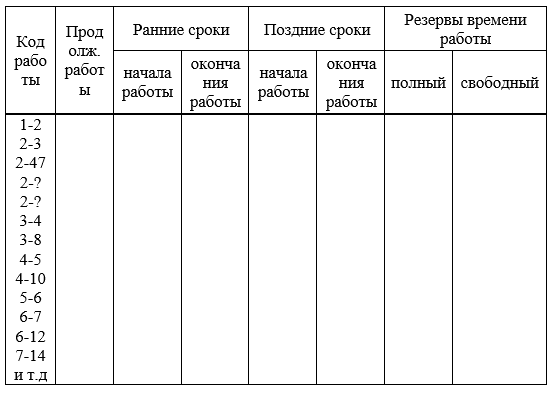 Код работы в составе сетевого графика определяется двумя цифрами, означающими номера ее начального и конечного события. При заполнении таблицы 4.1 работы рекомендуется размещать в порядке возрастания номеров их начальных событий.