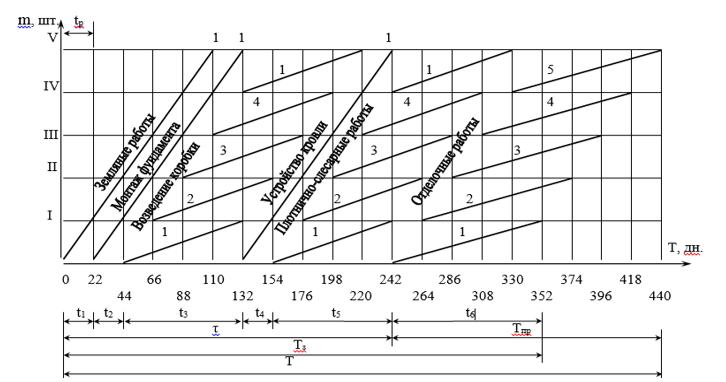 Основные параметры строительного потока могут быть определены графическим методом. Так, на циклограмме (рисунок 1.1) наглядно показаны продолжительности работ на частных фронтах работ t1, t2, ..., t6; период включения в работу частного потока (шаг потока) tp; продолжительность строительного потока T; число рабочих процессов; число бригад n; число захваток m. Кроме того, циклограмма позволяет определить период развертывания потока τ = 242 дня, период выпуска готовой продукции Tпр.=198 дней, производственный цикл – время, в течение которого на захватке ведутся работы до момента получения первой готовой продукции Tз= 352 дня.